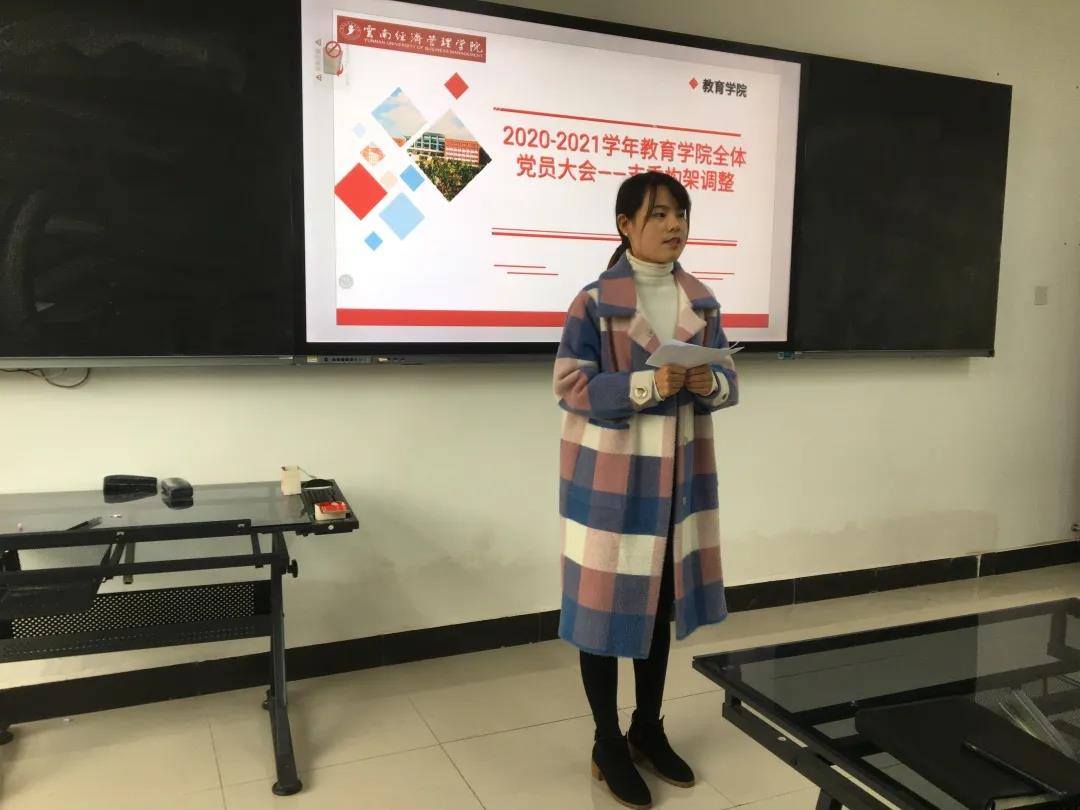 为优化教育学院各支部组织架构,培养专业党务人才,推动党总支工作全面开展,10月21日,2020-2021学年教育学院全体党员大会在三教501举行,针对各支部的支委调整进行讨论。教育学院党总支支委会书记、院长崔立华,副院长萧敏、丁淼以及教育学院全体师生党员参加会议。副书记杨淑雯主持会议。